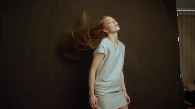 Shot of a girl sitting in a studio while playing with hair and flipping it