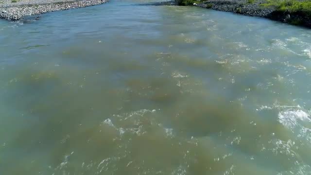 View from the cockpit IL-76. Flying over the river under the clouds. Russia