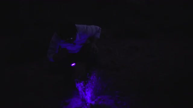Person using blacklight to search for scorpions in desert landscape at night