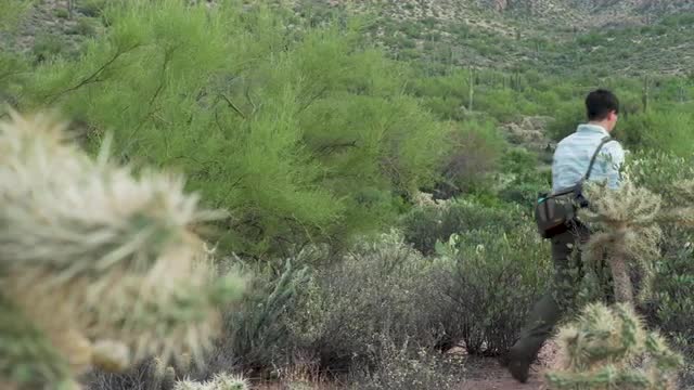 > Slide reveal as hiker walks by in desert, rear wide mid