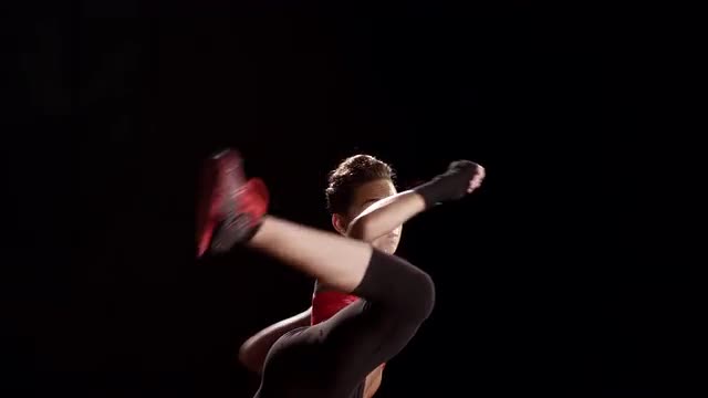 Young woman fighter martial arts training punches with hands on boxing gloves in air in fighting club