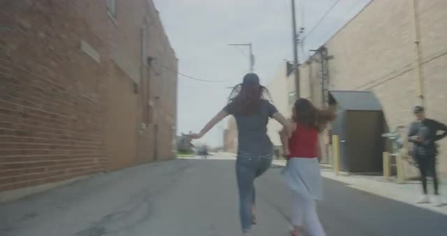 928689 - Friends skipping down an alley