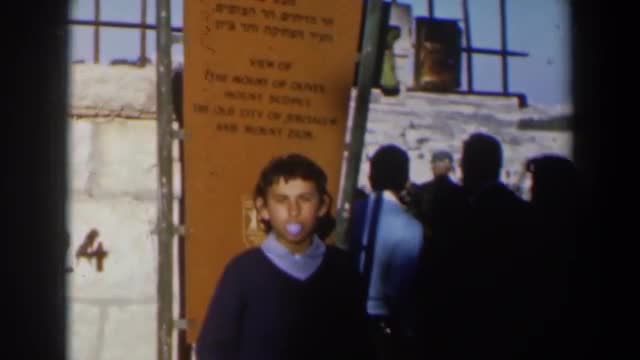 663712 - 1960: person blowing a bubble in front of a sign next to some other people ISRAEL