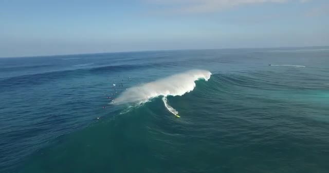 Aerial shot looking down on a wave as it leaves white scars in the deep bue ocean along the coast of maui