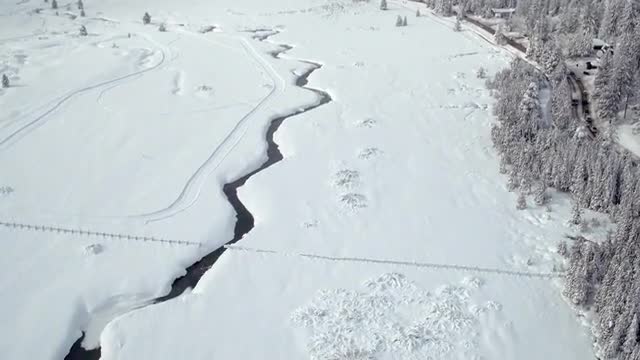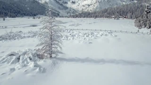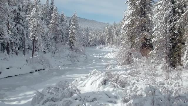 Sunshine on the pines in blowing snow near Black Lake, New Mexico.
