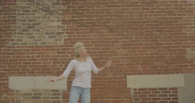 > Girl dancing in front of bricks