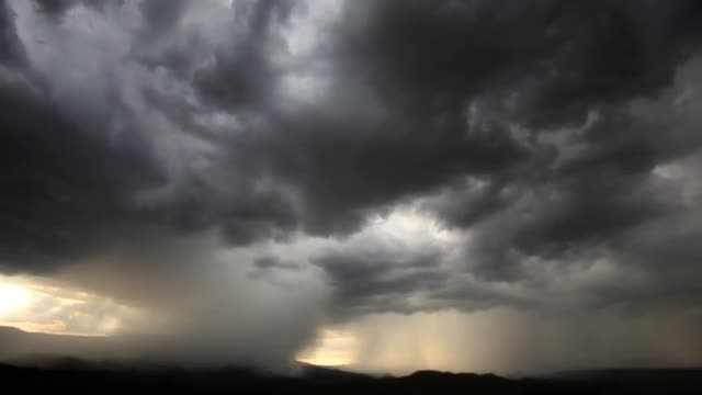 1091183 - Time lapse of dark clouds moving fast over city kicking dirt into the air