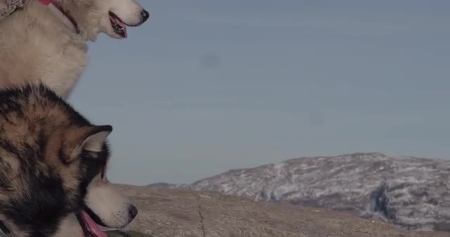 Two packs of Siberian huskies tow sleds through the snow of the mountains in Lyngen, Northern Norway.