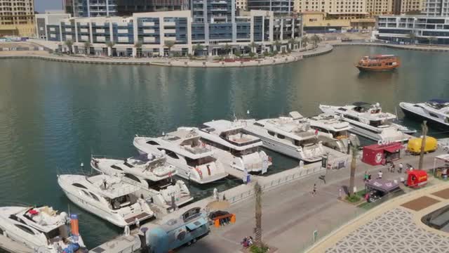> Tall buildings and harbour boats surrounding Dubai Marina, Dubai, United Arab Emirates, Middle East,