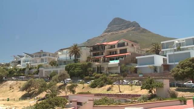 > A row of Colourful houses with a car coming down the street, Cape Town, South Africa