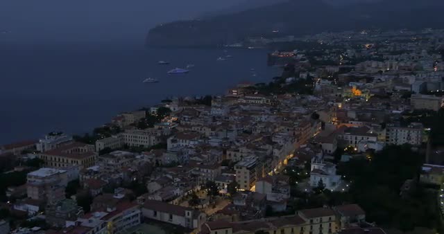 > Elevated panoramic view of Sorrento at dusk, Costiera Amalfitana (Amalfi Coast), UNESCO World Herita