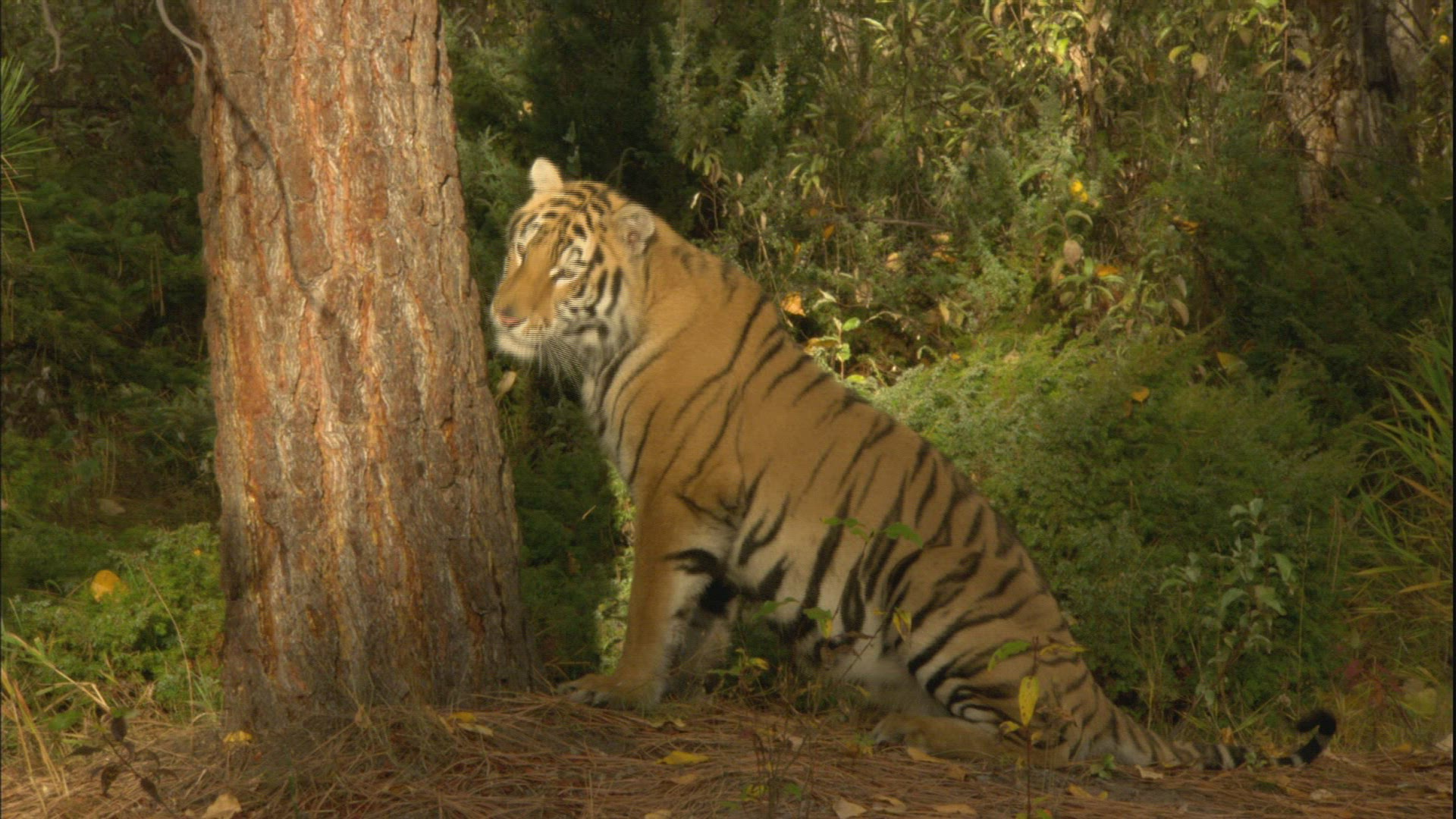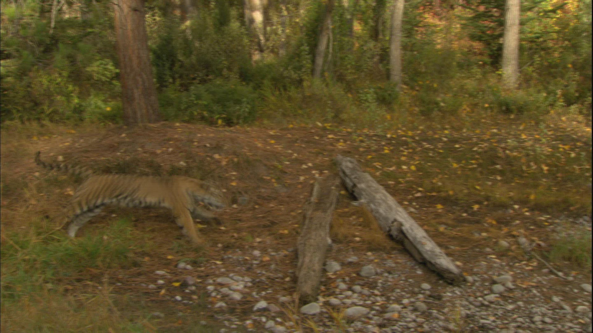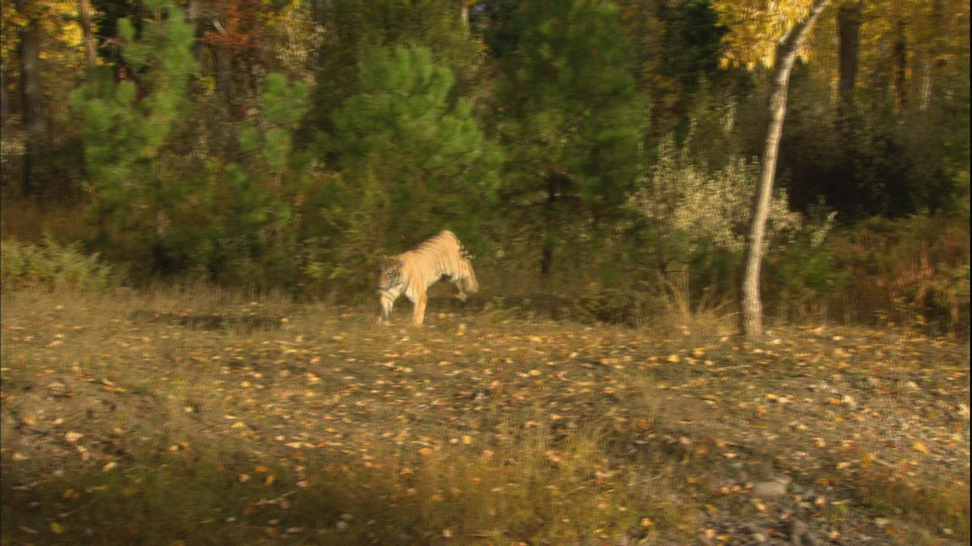 Medium Wide shot of mountain lion jumping off screen. Summer. Slow motion shot.