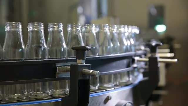 Quality control of glass containers in the factory for the production of baby food. Conveyor with clean milk bottles at big factory.