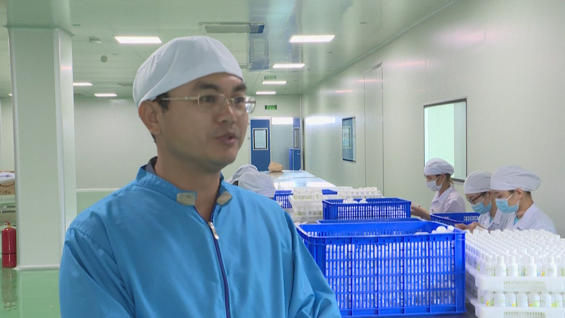 Employee goes through the sanitary control entering the workshop, the green signal is illuminated. Disinfection of hands at factory. Hand hygiene at food factory. Worker cleaning hands. Closeup