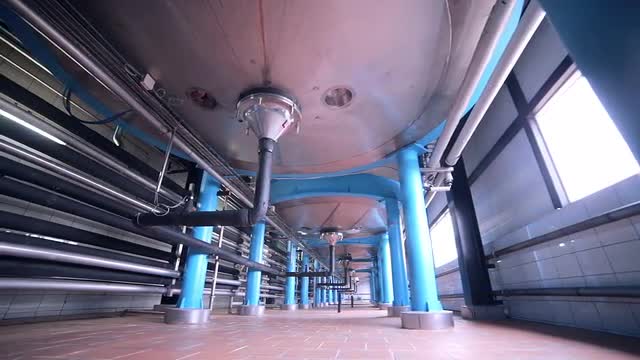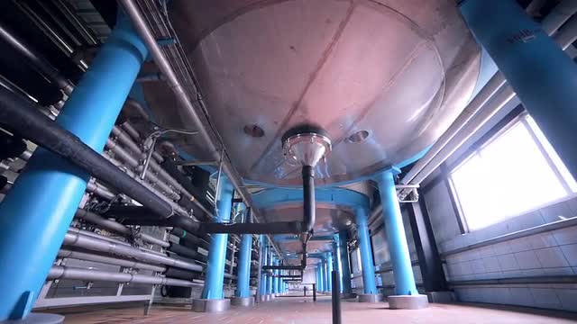 Industrial filter for water treatment, cose up. Pipeline in the workshop of a modern factory. Factory equipment controllers.