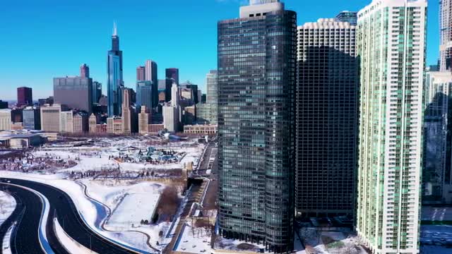 Flying over a forested, mountainous landscape in winter. Morning light. Snow flurrying in front of camera.