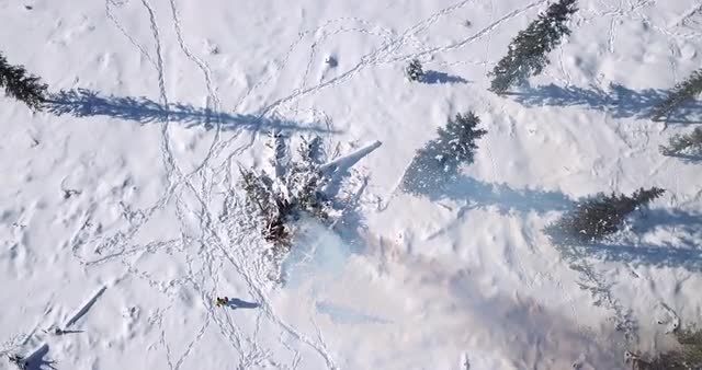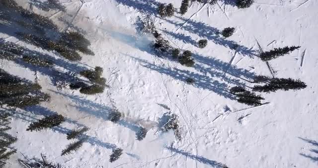 Flying over a burned forest looking straight down in winter. Snow covered ground.