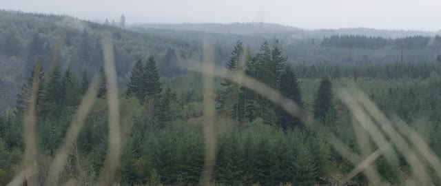175921 - Pine Tree/Xmas Tree Forest with Fog. Foreground wind blowing weeds. RED 5k Raw.