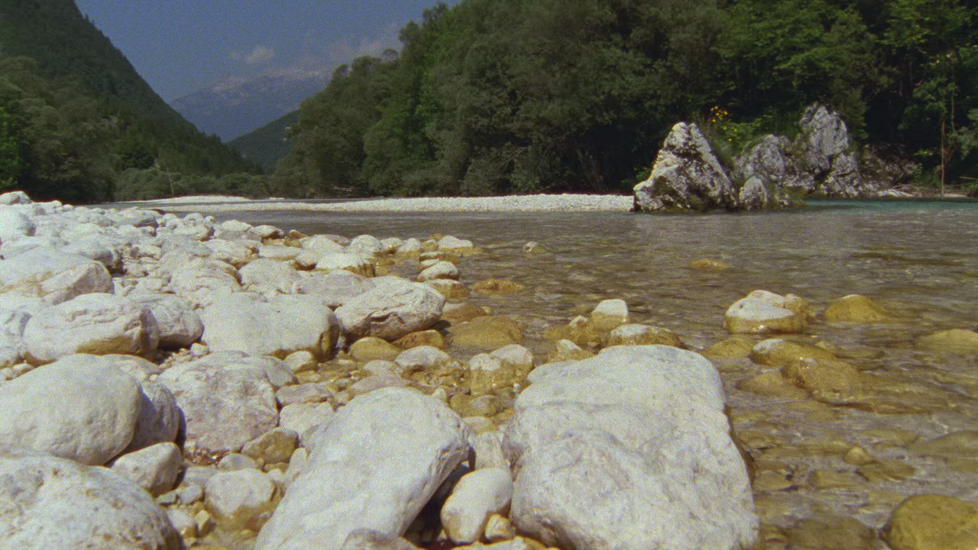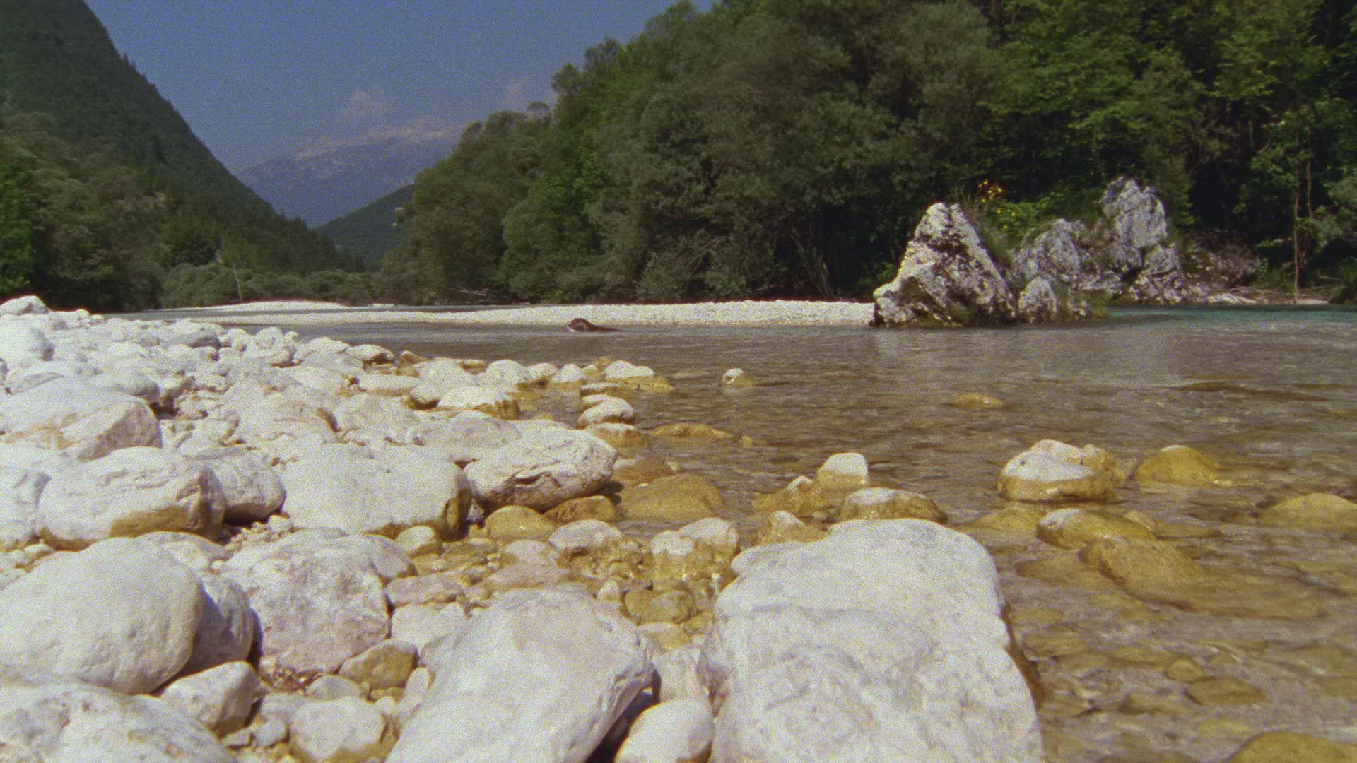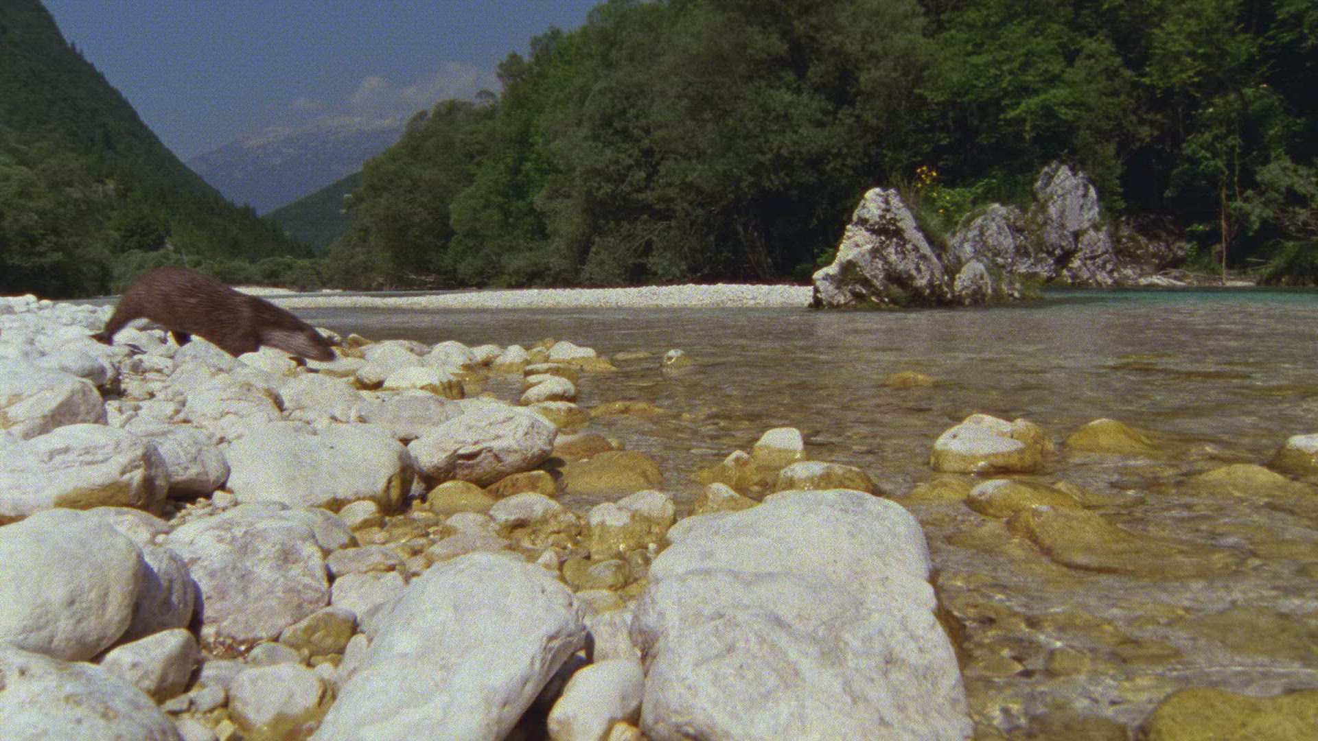 A large herd of bison grazing in a grassy river valley. A small river snakes along in the foreground.
