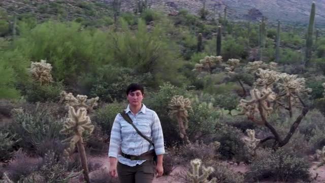 928297 - Woman hikes through desert landscape, static profile