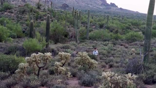 > Hiker walks through desert, long 4k forward flyover