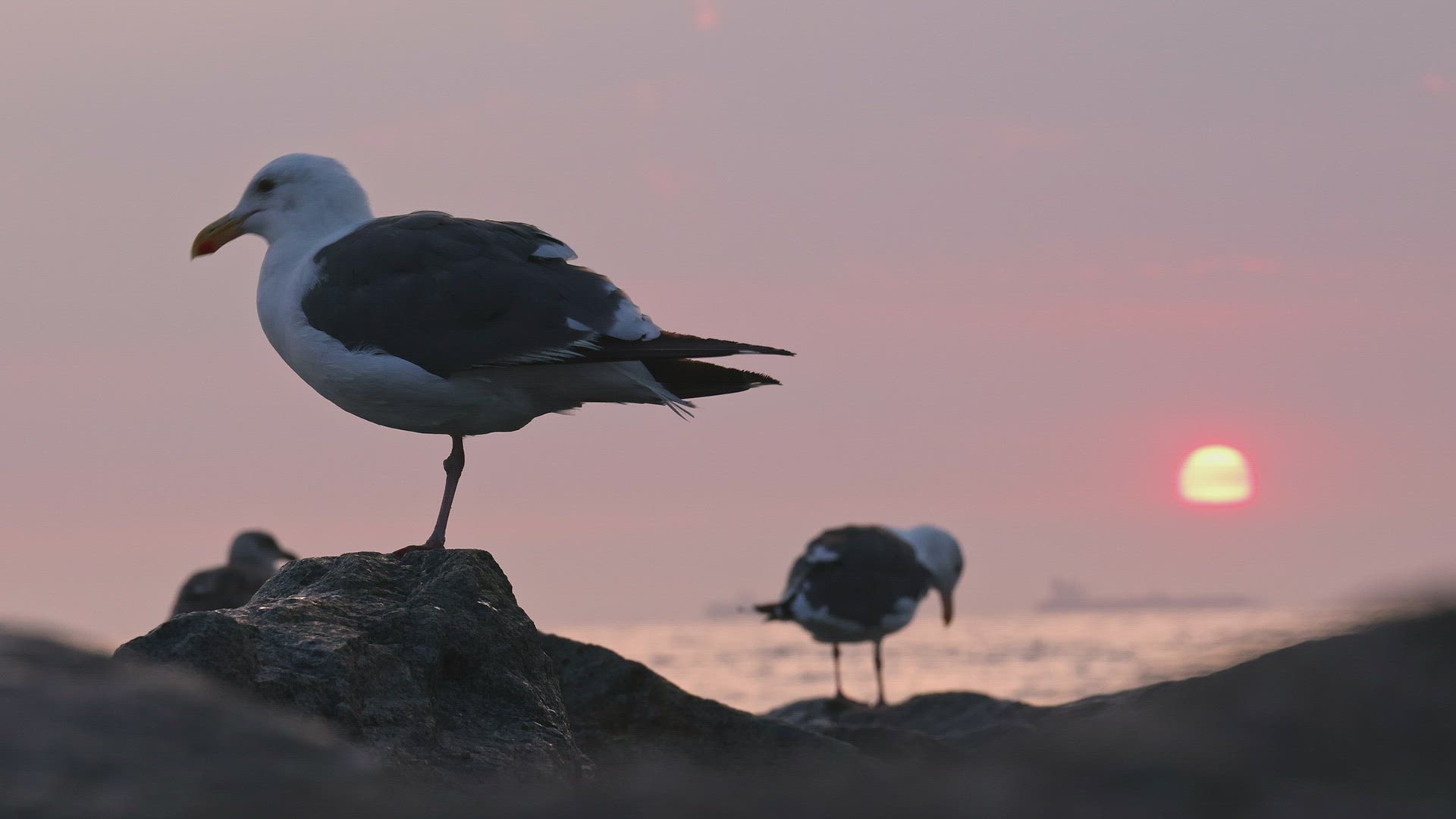 2135456 - Seagulls on rocks during colorful sunset over the Pacific Ocean