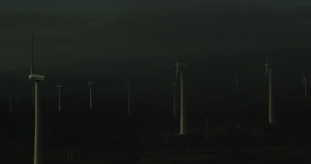 Panoramic view of one of the biggest wind farm in France located in Pyrénées-Orientales with foggy mountains in the background faintly highlighted by the morning light.