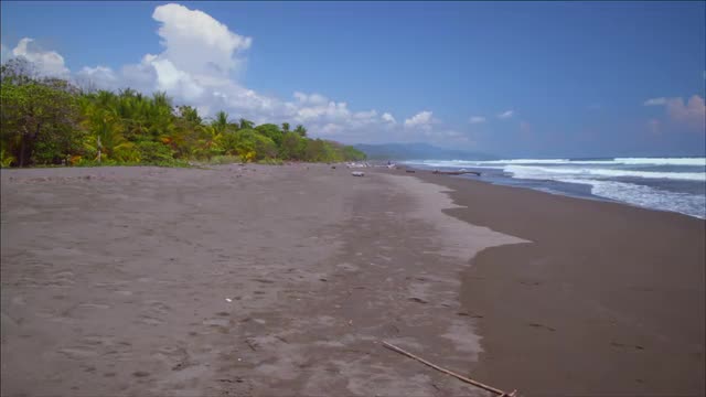 Footage of waves, sand, and tropical forest of beach. Distant mountains are also visible on the horizon.