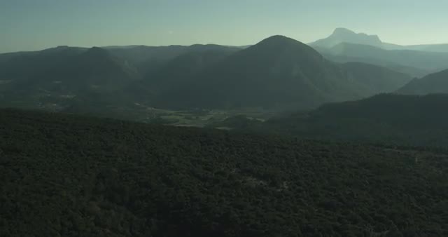 Panoramic view of a forest and misty mountains enlightened by the morning sunlight in Pyrénées-Orientales.