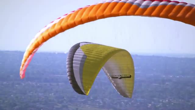 Two people are paragliding together, one in front of the other, with one parachute. They pass by another paraglider. Valley and highway can be seen below.
