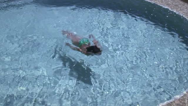 Slow motion shot looking down at a woman swimming in a pool.