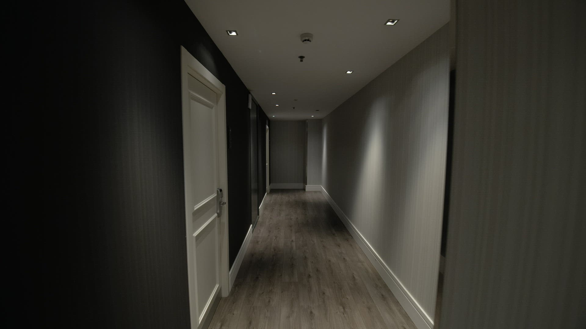 1033209 - Child walking in hotel hall and opening room door with keycard