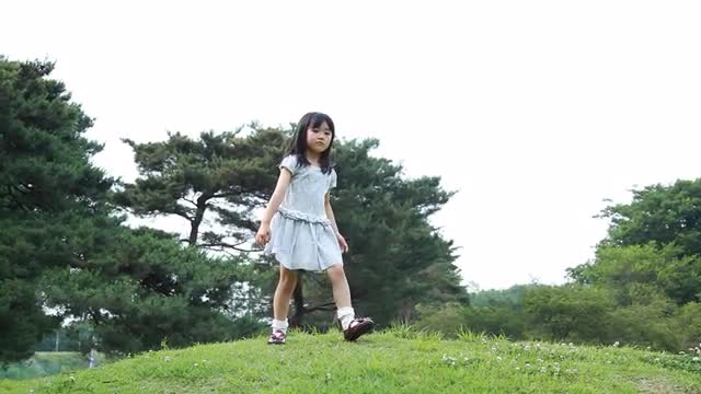 420071 - Young girl running towards camera and looking around in wonder