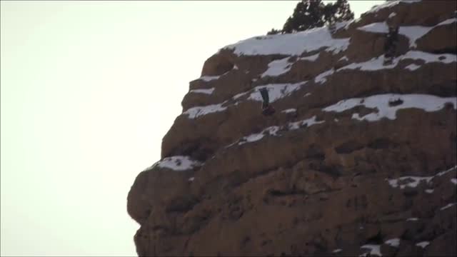 > Slow-motion shot of base jumper skiin down side of clip and flipping in air.