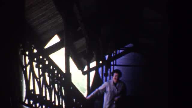 663797 - 1960: smiling woman in long coat walks towards camera up a long flight of covered stairs BALTIMORE M