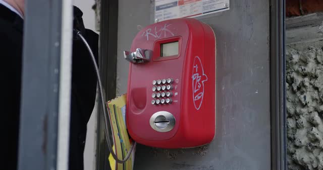 Close up of adult man talking on payphone in phone booth