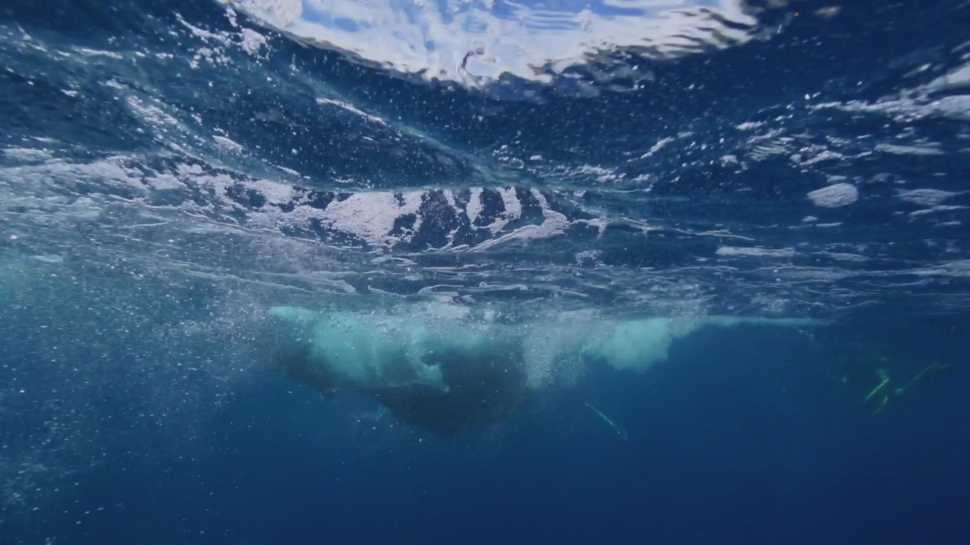 Extremely rare footage of a male Humpback whale performing an aggressive tail throw.
