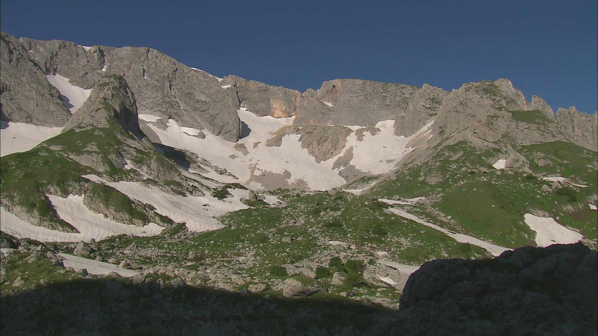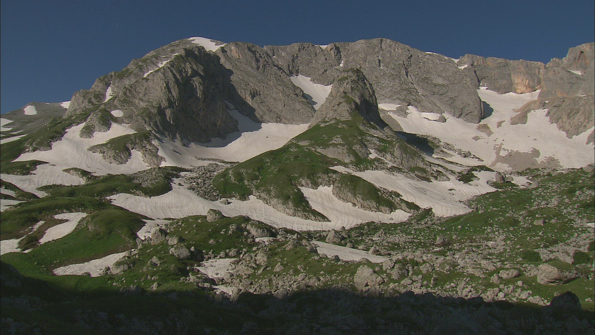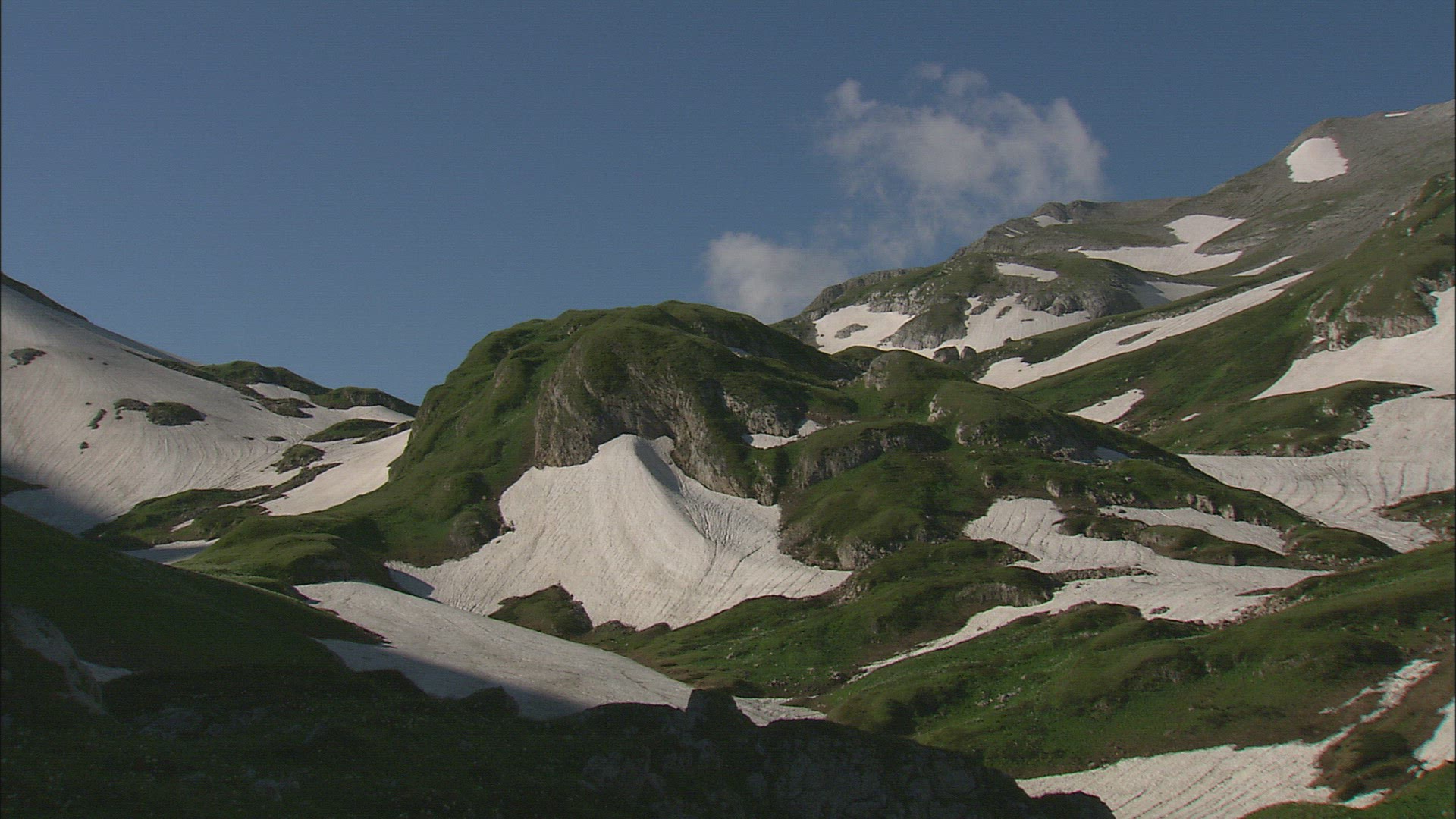 Static shot of snow-capped mountains in Switzerland