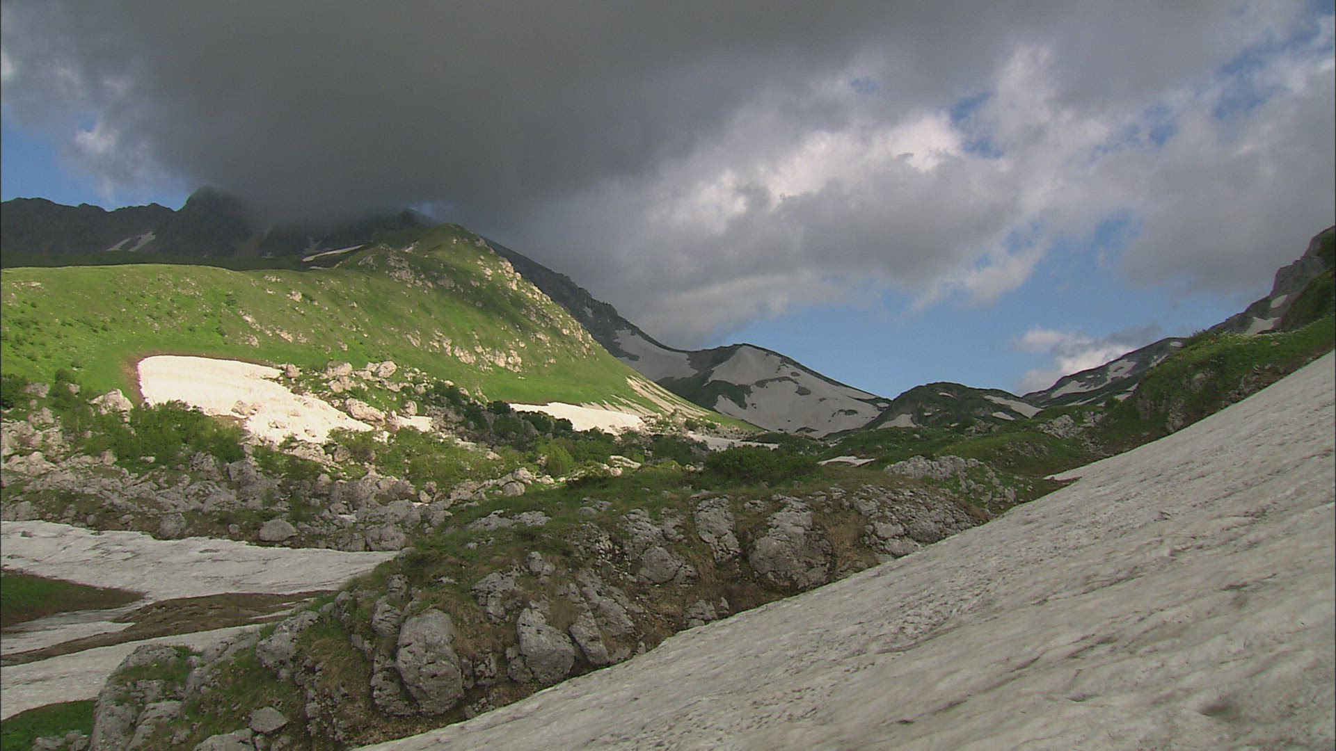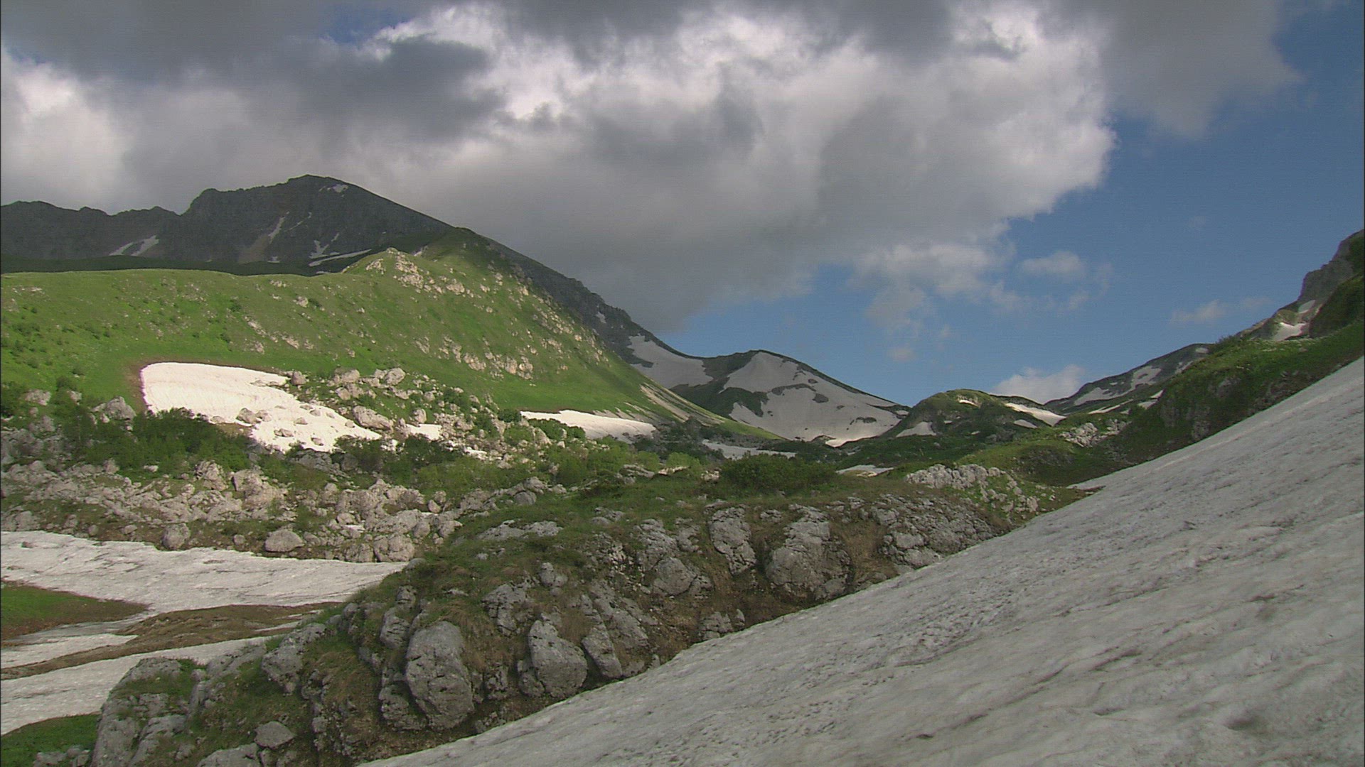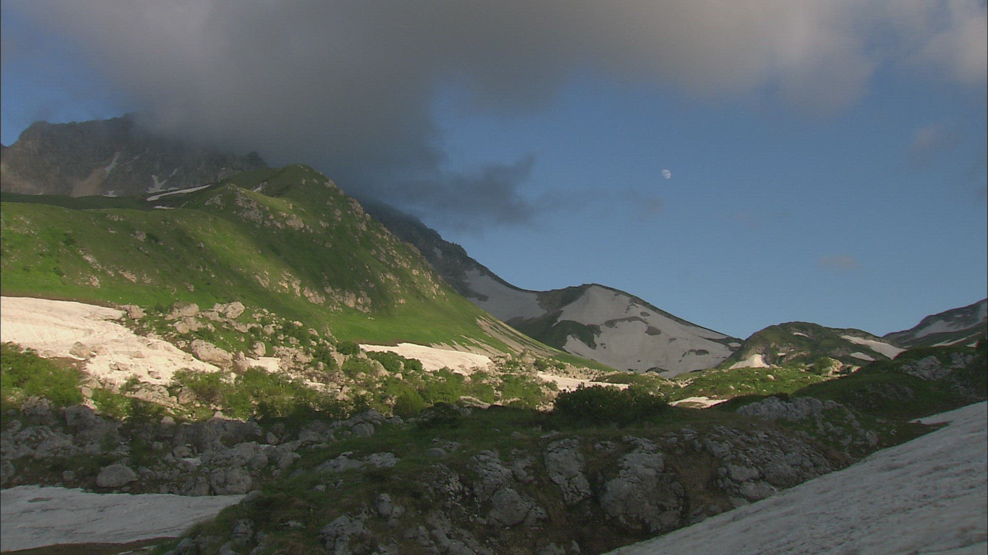 Static shot of snow-capped mountains in Switzerland