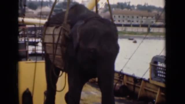 708554 - 1946: elephant is hoisted overhead and supported by wooden sling under body COLOMBO CEYLON
