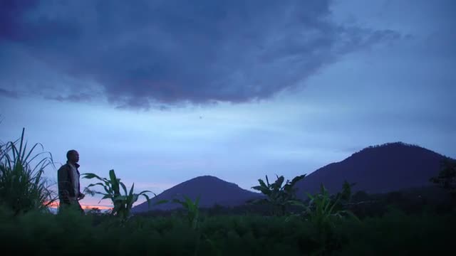 Man slowly twirls and tosses Swiss flag up into the air, catching it expertly. He stands at the edge of a lake, and beautiful mountains rise up behind him.