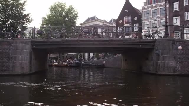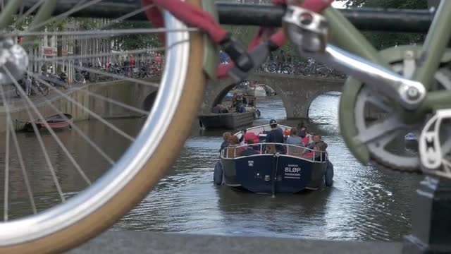 Establishing shot of a city street in Utrecht at night near a canal. (No faces discernible, signs and logos removed in post)