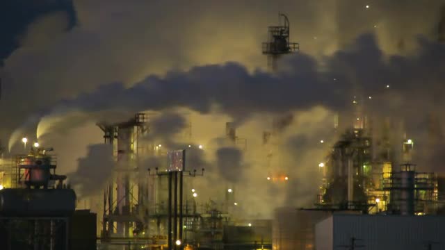 Stationary shot of factory smoke stacks during the night in Wyoming.