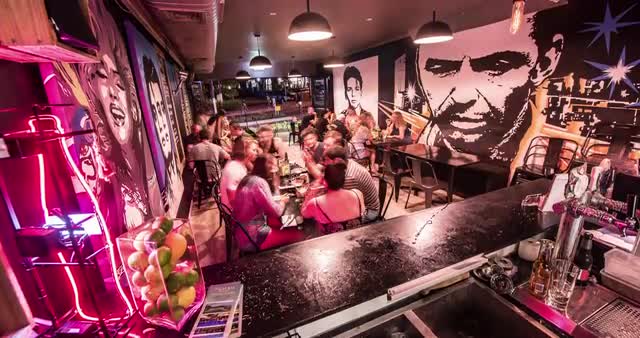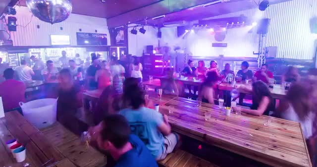 Establishing shot of a roadhouse / bar on a pier near the ocean.