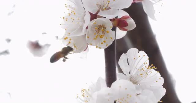 A bee pollinates a cherry blossom. 4K cinematic shot.