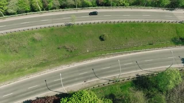 Cinematic aerial tracking shot of a single vehicle entering the city.