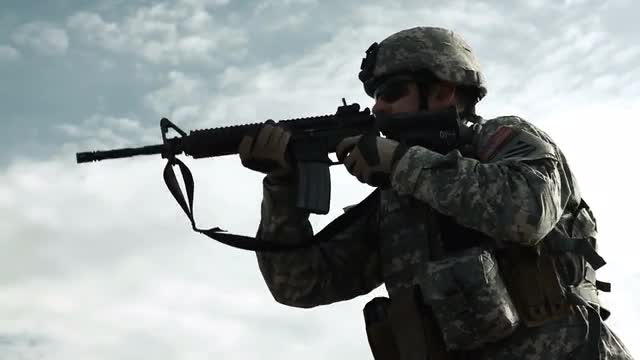 > Soldier practicing firing against sky background