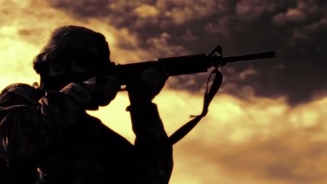 Skyward panning shot of soldier practicing on firing line. At Green Beret United States Army Special Forces range.