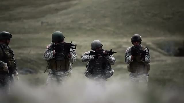 Static shot of a line of soldiers walking 'stalking' and readying their weapon. At a Green Beret United States Army Special Forces range.