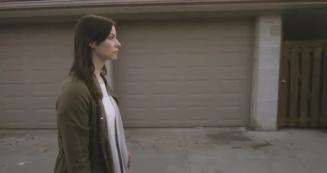> Cinematic portrait of a woman walking in an alley.